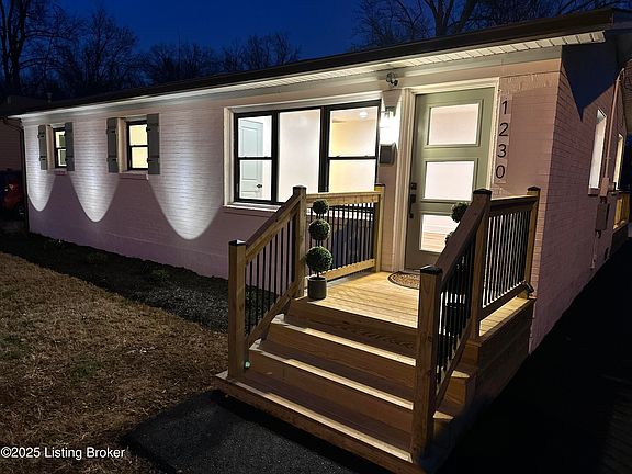 Welcome to the ''Doll House'' at 1230 Dahl Rd — a beautifully renovated 3-bedroom, 1-bath all-brick ranch sitting on over a quarter acre. Located on a quiet side street just minutes from shopping, freeway access, and major Louisville employers (Ford, GE, UPS), this home blends modern style with quality craftsmanship and long-term efficiency. The home opens into a spacious living area, leading to the designer kitchen at the center of the layout, with all three bedrooms and the beautifully renovated bathroom located just down the hallway. Inside, the entire home has been transformed with updated electrical, plumbing throughout, subflooring, luxury LVP flooring, drywall, trim, fresh interior paint, and all interior doors replaced. The kitchen and bathroom were taken to the studs and rebuilt with soft-close shaker cabinets, butcher block countertops, a farmhouse sink with a modern gold faucet, coordinated gold hardware, appliances, designer lighting, and a beautifully tiled tub surround. In addition to the cosmetic renovation, the home offers excellent mechanical peace of mind. The roof is approximately two years old, and a Trane HVAC system was installed in 2024, including furnace and 2.5-ton Trane AC unit. These upgrades, combined with energy-efficient windows, make the home comfortable year-round while keeping heating and cooling costs exceptionally efficient. The exterior is just as impressive with fresh paint, soffits, bronze gutters, bronze energy-efficient windows, farmhouse-style shutters, and exterior doors. A treated-wood front porch with metal spindles, decorative post caps, and upgraded lighting adds to the home's curb appeal. A fresh black asphalt driveway leads to the deep private backyard, where a massive treated-wood deck spans the rear of the home, creating the perfect space for outdoor entertaining. Just beyond the deck, a 36' x 18' gravel patio with a fire pit provides an additional outdoor gathering area or flexible space for seating and recreation. With thoughtful design, quality materials, energy-efficient upgrades, and attention to detail throughout, this home is truly move-in ready and a rare find in this price range.