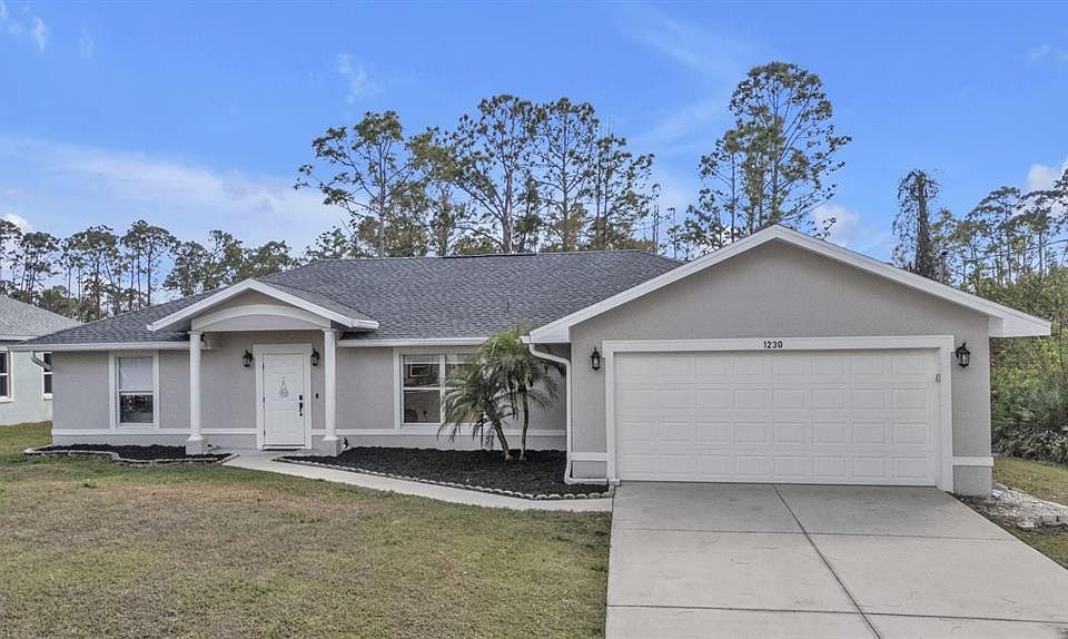 This meticulously maintained pool home is set on a spacious, oversized lot surrounded by lush natural woods in one of Southwest Florida's most sought-after areas—North Port. Move-in ready, this home features a new roof (2022), a new water system (2024), and fresh paint throughout both the interior and exterior. Inside, you'll find the kitchen boasts beautiful oak wood cabinets with updated hardware, a breakfast counter, and two large pantries for ample storage. The expansive master bedroom offers dual extra-large walk-in closets, while the master bath includes a walk-in shower and a large vanity. The den/office is spacious enough to be converted into a fourth bedroom. Step outside to a wooded backyard oasis, complete with a pool, BBQ area, fire pit, and a permitted workshop with electricity—ideal for use as a pool house, playhouse, storage, or hobby room. This home is a must-see, offering an excellent opportunity for families or snowbirds. Conveniently located near I75, Cocoplum Shopping Plaza, golf courses, riding/walking trails and beaches, it’s a perfect spot to call home.