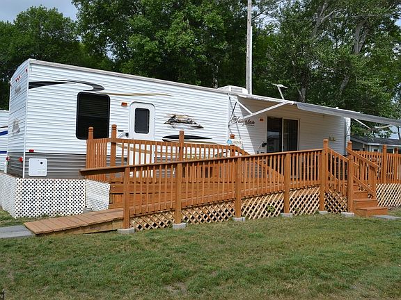 Beautiful Views of Lake Osakis from this well cared for Park Model located in Blacks Resort. Just imagine sitting on the deck under the awning enjoying the views along with the sunrise and sunsets all while the work is done for you by the Association. Trailer features spacious floorplan with fireplace and lots of built in storage. Resort features fishing cleaning building additional shed for gatherings and tools. Resort is located near the city beach and trailer is located near the lagoon which offers privacy and great fishing. Storage Shed and some furnishings will stay with property.