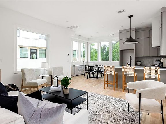 Welcome to this charming home nestled on the serene shores of Mado Pond. This picturesque abode boasts an inviting open floor plan, seamlessly integrating the living and dining areas, perfect for both intimate gatherings and lively entertaining. As you come inside, natural light floods the space, illuminating the contemporary design and modern finishes. Descending to the terrace level, you'll discover a cozy bedroom and full bathroom, also ideal for a potential kids bunk room. Ascend to the third floor, where another bedroom + bathroom awaits, along with a balcony, ensuring every resident enjoys their own oasis. Finally, ascend to the final fourth floor, where a delightful surprise awaits—a rooftop patio boasting panoramic views of Mado Pond. This rooftop sanctuary offers the perfect setting for al fresco dining, sunset cocktails, or simply unwinding amidst the beauty of Serenbe. With its seamless blend of indoor-outdoor living spaces and stunning vistas at every turn, this home exemplifies the essence of Serenbe living. Coming outside your front door, you are a short distance away from the Gym, Spa, restaurants + over 20 miles of soft surfaced nature trails with protected forest views.