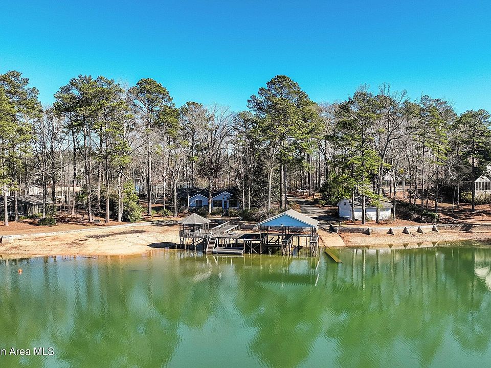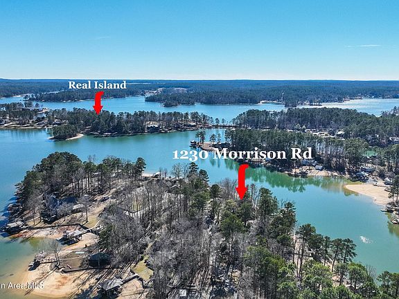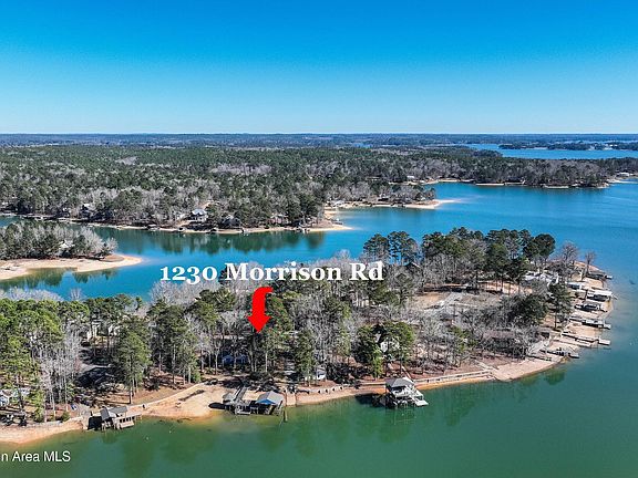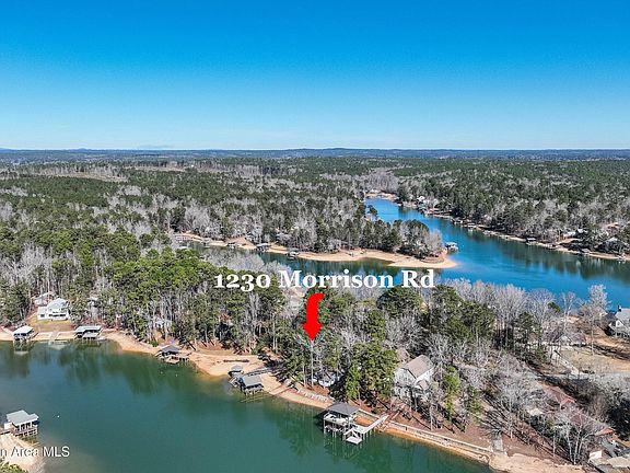 Lake Martin water front home near Real Island with a flat lot is what you will find at 1230 Morrison Rd. This 3 bedroom 3 bath home has two primary suites. With an open kitchen and living area that has great lake views and a wood burning fireplace to enjoy in the cooler months while living on Lake Martin.This home had a new roof put on in 2024. There is a outbuilding which could be used as storage or bunk room. Another feature is a large two car or two boat garage right off the water's edge where the boat ramp is located. You will also be pleased with the +/- 243 feet of shoreline, sea wall with steps, boat docks with a boat lift. This large Lake Martin pier has plenty of room to cast out fishing lines, swimming, floating on the lake, or just sunbathing. Call for your appointment to see.