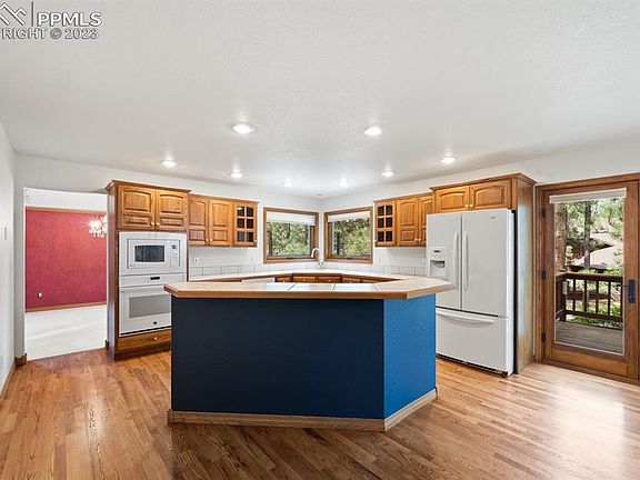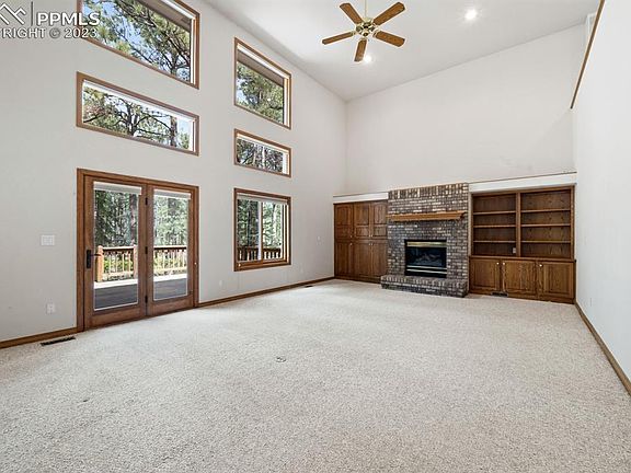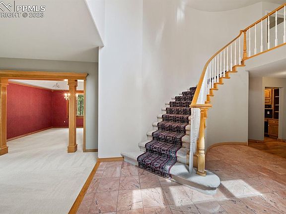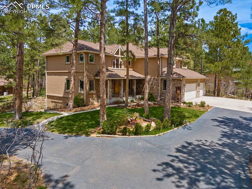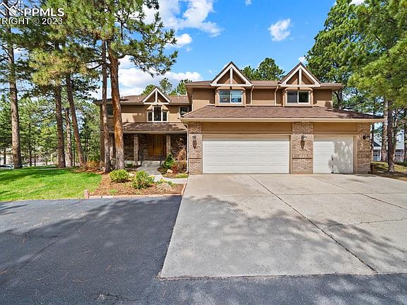 Spacious stucco and brick 2-Story on a beautifully-treed .62-acre corner lot in Woodmoor. Over 5,200 square feet of living space with formal and informal spaces for entertaining. Enter into the grand foyer with gracefully curved staircase. Formal living room and elegant formal dining room with crown molding and decorative pillars offer space for your more sophisticated occasions. Large kitchen with island, gas range, walk-in pantry, planning desk area, breakfast nook, and abundant cabinetry provide plenty of space for preparing meals. Family room with soaring 2-story ceiling and gas fireplace walks out to the large rear deck with retractable awning overlooking the peaceful back yard and flagstone patios. Upstairs is a loft library area and three bedrooms and two baths including the master suite featuring a gas fireplace and adjoining 5 pc bath with dual walk-in closets. The finished walk-out basement offers more entertaining space with another large recreation room with wet bar complete with dishwasher, fridge, and microwave. Two more bedrooms share a three-quarter bath. Storage is no problem with a huge 14 x 26 unfinished room with shelves and a worktable. This home features dual furnaces, central air, a recirculating pump for the water heater, an oversized 3-car garage, and an oversized main-level laundry room with closets, utility sink, another refrigerator, and more storage. Conveniently located just minutes to the I-25 corridor and downtown Monument, Woodmoor also has green spaces and 24/7 security patrol.