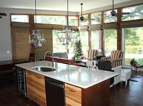 Custom, contemporary, newer built home on 400' of the AuSable River Mainstream. Full length wall windows offer an abudance of natural light and exceptional views. Open floor plan great room with vaulted ceilings for entertainment.custom kitchen w/ solid surface c-tops, large master bedroom with en suite and walk in closet. 8x17 covered porch, large wrap around patio; custom quality window treatments; landscaped yard, central air conditioning and a metal roof!