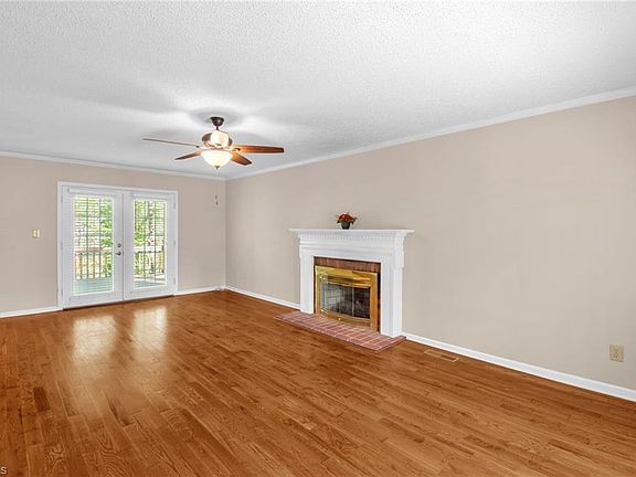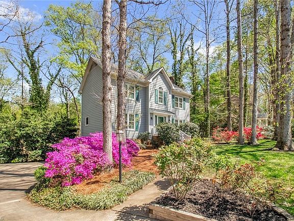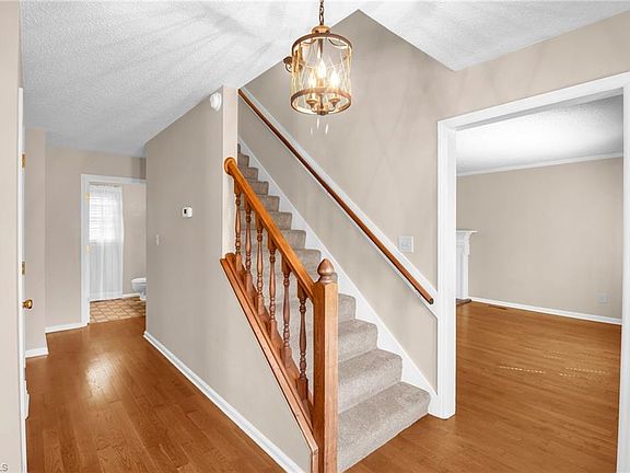NEW PRICE! Just updated with new interior paint! Inviting home tucked away on a cul-de-sac, surrounded by mature trees & beautifully landscaped. Inside, the bright kitchen offers ample cabinets, a pantry & space for a breakfast nook w/ door leading to large deck. The main level has wood floors, a formal dining room, convenient laundry room, & a half bath w/tile flooring. The spacious great room spans the depth of the home, with a gas log fireplace & French doors opening to the other end of the deck – perfect for relaxing. Upstairs, the layout keeps all bedrooms together, with the primary BR situated opposite two secondary bedrooms. New carpet on stairs & second floor. Other upgrades include updated lighting & plumbing fixtures, window blinds & new garage doors. The finished bonus room in the basement offers a tray ceiling, recessed lighting, new paint, & new carpet. 30-year roof with 4" gutters in 2016 adds peace of mind, & the 2 car garage includes a workbench & pegboard.