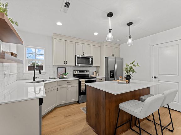 Experience the epitome of low-maintenance luxury living! Situated in a prime location near downtown and BSU, this exquisite 3 bedroom, 2.5 bath townhome is a dream come true. Step inside to discover a stunning open kitchen, complete with a spacious center island perfect for entertaining, elegant white quartz countertops, sleek white subway tile backsplash, top-of-the-line Whirlpool s/s appliances, and stylish grey wood-grain cabinetry. The living room seamlessly flows onto a charming large patio, ideal for outdoor relaxation. Revel in the sophistication of grey luxury vinyl plank floors throughout the living spaces, while plush grey carpeting graces the bedrooms and upstairs hallway. Upstairs, find three bedrooms, including a primary suite thoughtfully separated from the others by two bathrooms, boasting double vanities for added convenience. Outside, indulge in community amenities such as a bocce ball court, gazebo, and picnic area with tables and chairs, and dog area! Say goodbye to the hassle!