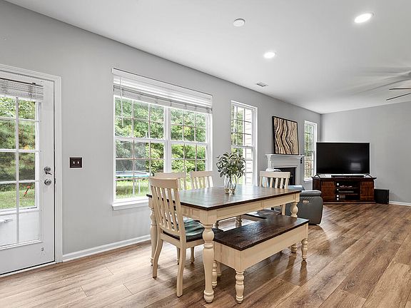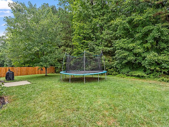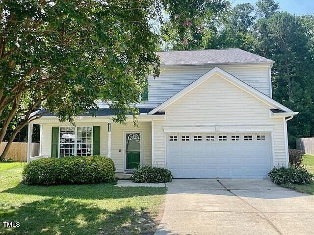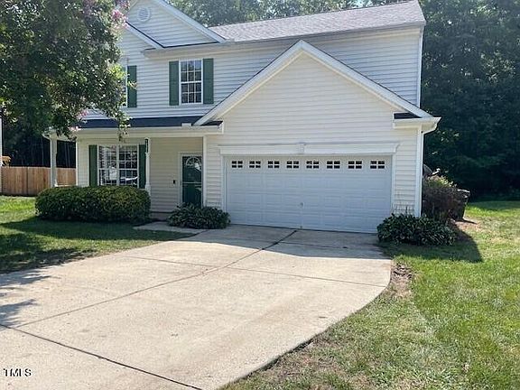 Discover the perfect blend of convenience and comfort in this wonderful home! This spacious 4-bedroom gem is nestled in a cul-de-sac, with a back patio overlooking a tranquil natural wooded setting. The natural area behind the home is owned by HOA-unbuildable. NEW Roof, replaced 7/30/24! The home features a cozy living and dining room (currently used as office and flex space), a spacious family room that opens to the kitchen, a lovely breakfast area, a gas log fireplace, and a luxurious primary bath with dual vanities, WIC, garden tub, and separate shower. The convenience of a refrigerator, washer, and dryer is included. Step outside to your rear patio and soak in the beauty and serenity of the natural surroundings. This home also has a 2-car garage. Recent upgrades in 2021 include LVP flooring throughout the main floor and upstairs hallway, new carpet upstairs, fresh paint, and most light fixtures were upgraded. Additionally, ceiling fans, a welcoming front porch, and mature landscaping enhance the charm of this home. Convenient location near RDU Airport, Brier Creek Shopping/Dining, and Harrington Grove Swim & Racquet Club.