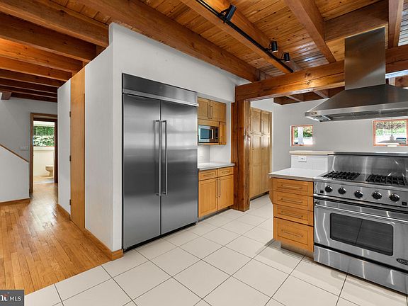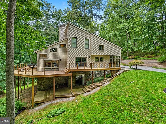 Shaded drive approach leads to a 6.7 acre wooded oasis in Triadelphia Woods presenting an elegant park-like setting for this 5,818 sqft contemporary style home, which embodies elegance and style, perfectly designed to capture natural light. A cool foyer with a natural wood ceiling welcomes you inside to find enriched hardwoods, a stone chimney, exquisite sight lines, a formal living room adorned by an ambient fireplace, a vaulted wood ceiling with skylights, and glass sliders opening to a wrap-around tiered deck overlooking the luxuriant surroundings. A large dining room is adorned with French doors opening to the deck and an exposed beam wood ceiling that carries into the sitting area and kitchen. Prepare to entertain in the chef’s kitchen boasting gourmet stainless steel appliances including a ceiling mount professional exhaust, glass front and Shaker cabinetry, a peninsula with a hand sink, and a breakfast room with wrap-around windows framing a lush wooded view. Located on the upper level, the owner's suite presents a vaulted wood ceiling with an overlook, a walk-in closet with dressing area, drop ceiling fans, an array of sparkling windows, and a luxe spa-like bath with ceramic flooring, a custom designer ceiling with wood accents, a double sink vanity, a dual head separate shower, and 2 steps to a soothing jetted tub. Enjoy relaxing and play time in the finished lower level featuring high ceilings, a rec room with a Rais Nordic wood stove, a custom wet bar, recessed lighting, a games or sitting area, a full bath, steps to a bedroom, a utility room, a study or exercise room, and a large glass slider walkout to a lower deck overlooking the lush tree-lined backyard. Attached to the rear of the garage is a 40x28 multi-purpose room with a separate entrance currently being used as a workshop, which is ideal for the hobbyist or can be used for a range of leisure pursuits. A tranquil, private wooded cul-de-sac setting that is central to shopping, dining, parks, commuter routes, BWI Airport, and the Washington – Baltimore corridor.