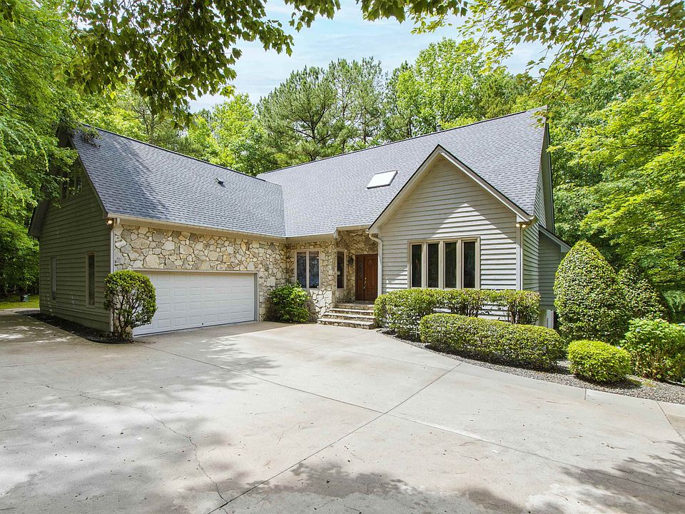 Welcome to your private retreat! This beautiful estate is nestled on approximately 2.3 acres and surrounded in rear and on one side by Army Corp of Engineers property. So many surprises await you as you step into the dramatic great room with soaring ceilings, a wall of windows overlooking this spectacular property, and on cool winter nights, enjoying the stone fireplace with gas logs. Views abound from the breakfast room with cathedral ceilings and a large master suite. There are 4 spacious bedrooms with the master suite on the first floor and an updated master bath and spacious closets with built ins for exceptional organization. The secondary bedrooms are large and have their own ensuite. The lower level has a kitchen and other rooms for multigenerational living and has a separate outside entrance. Another outstanding feature of this home is the two home offices and a first floor room for a library or sitting room. If the owner has a pet, there is currently a dog run fenced in for the owner's convenience. Come embrace nature in this gorgeous North Raleigh residence