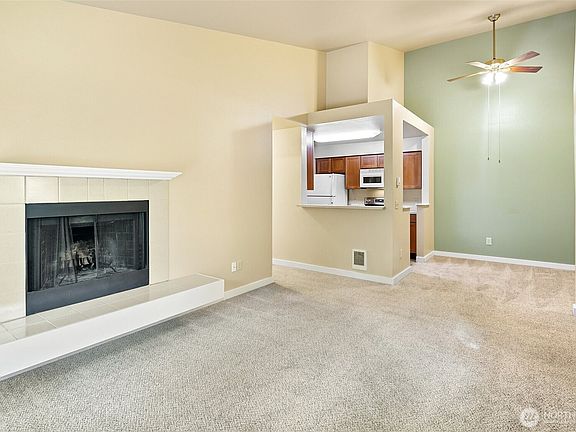 Welcome to your top-floor condo in the highly coveted Front 9 condos! This one bedroom, one bathroom open floor plan unit with its own covered parking spot right next to the unit! Bright, open living space with vaulted ceilings and a real wood-burning fireplace, seamlessly connected to the kitchen with a separate dining area. Large one bedroom with ample closet space and full primary bathroom with full sized washer and dryer! Well maintained and move-in ready! Ample amenities such as an indoor and outdoor pool, game room, gym, basketball court, clubhouse and community areas. The reserved parking spot is conveniently steps from the unit. Minutes away from the ferry, Boeing and freeways.