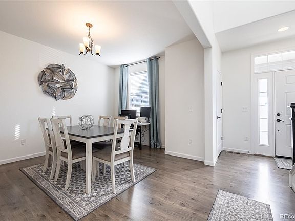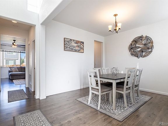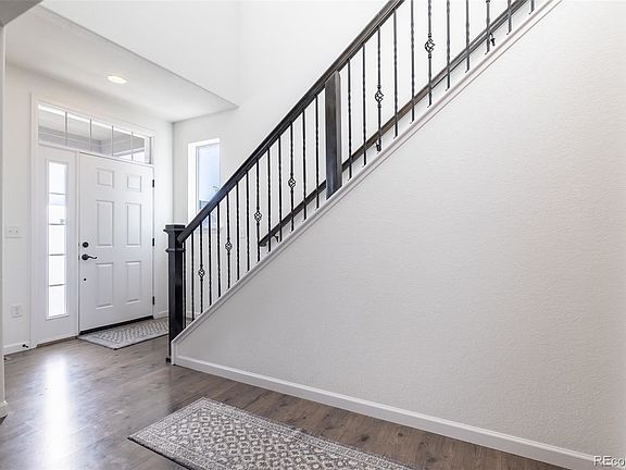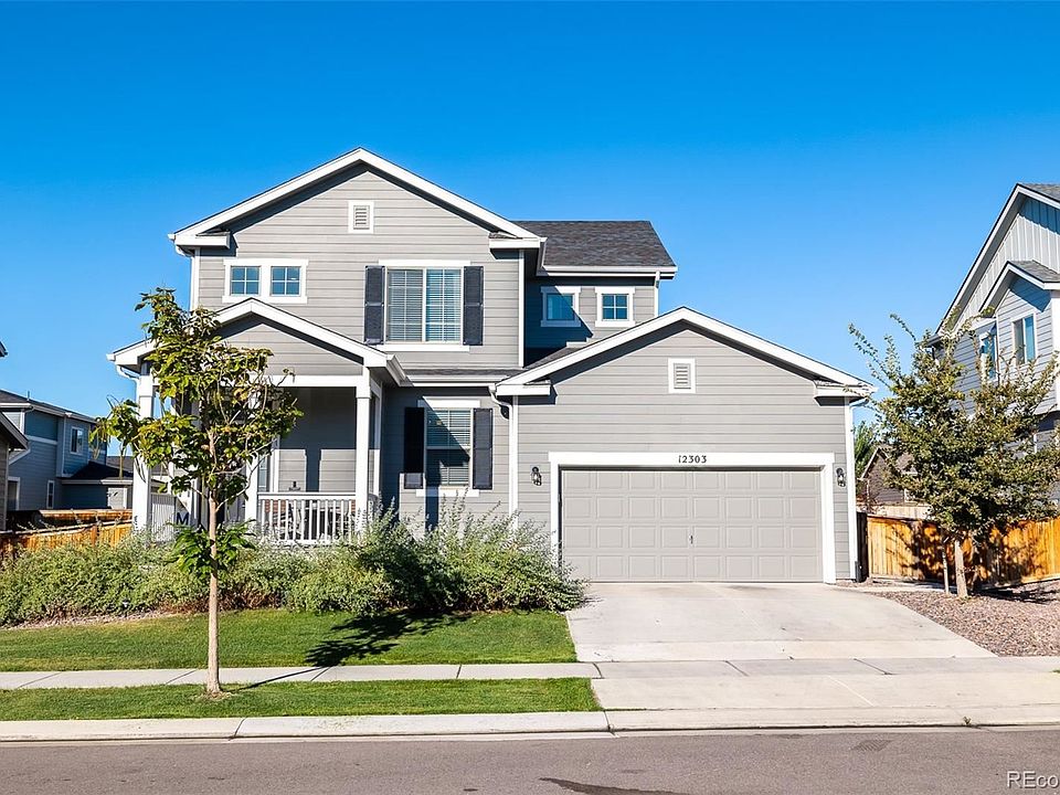 Gorgeous move-in ready home at The Outlook! As you enter this beautiful 2-story home you'll be greeted by vaulted ceilings and lots of natural daylight. Enjoy an open concept main floor with a formal dining area that could also be enclosed to become a future office/den. Upstairs you'll find the Primary Bedroom Suite plus two additional bedrooms and full bath. The Kitchen features granite slab countertops, gas range, 42" upper cabinets, stainless steel appliances, and island with bar seating. Upgraded features include vinyl plank flooring throughout, convenient upper level laundry, coffered ceiling in the Primary Bedroom, and front & rear yard sprinklers! The basement is ready to be finished - add an additional bedroom & bath! Entertain guests on the spacious patio overlooking the green private backyard! Just 25 minutes to Downtown Denver, 17 minutes to DIA, 5 minutes to Buffalo Run Golf Course, and just minutes to shopping and dining.