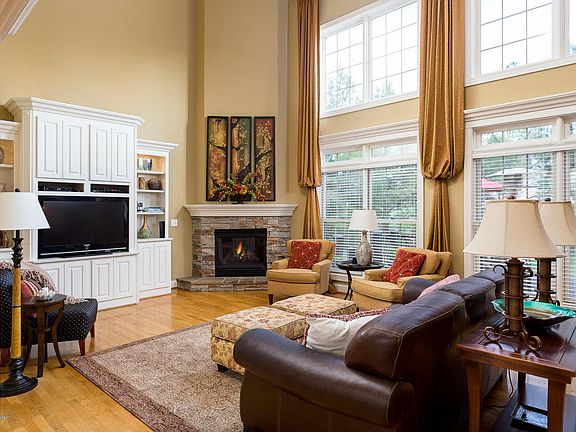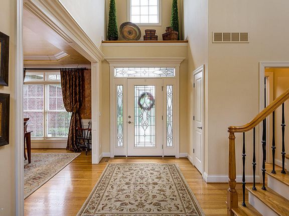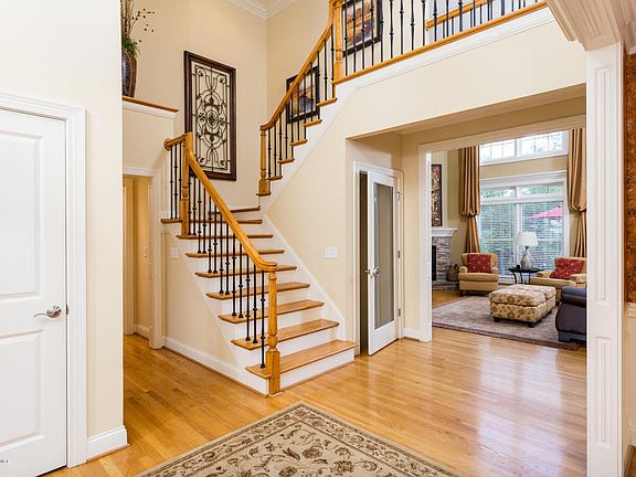 Enter the dramatic great room and open floor plan with gas log fireplace flanked by double windows for lots of light. The great room opens to the conveniently located eat-in kitchen with granite countertops, spacious pantry, and door to the custom built covered deck wired for television. Enjoy the first floor master bedroom with double trey ceilings and elegant master bath with a relaxing spa shower system. The second floor has 3 bedrooms, a bonus room and two full baths. The walkout lower level will amaze with a great family room, a game area, a bedroom, bar area, exercise room, and impressive home theater complete with trey ceilings and twinkling LED star lights. Sit around the custom gas fire pit on the lower level patio and enjoy nature while the irrigation system waters the lawn.