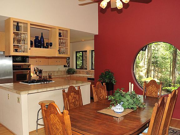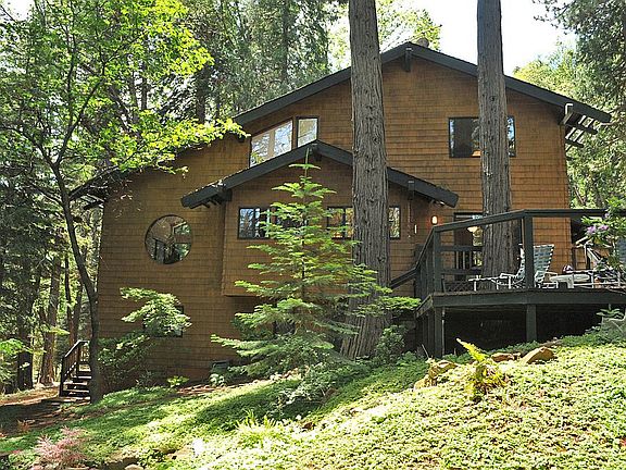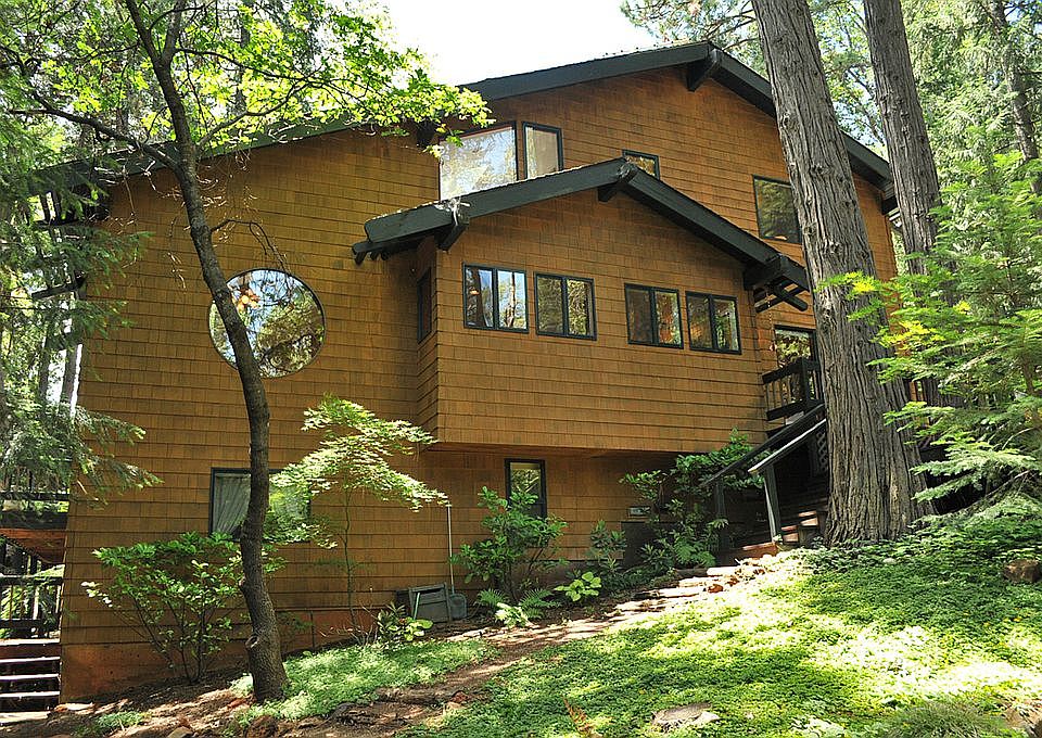 Architecturally unique executive home designed by Rusty Schutz. Banner Mountain Retreat is nestled in a hand-groomed forest in an exclusive Banner Mountain neighborhood. The large main floor master bedroom opens onto an expansive deck over-looking landscaped pond & waterfall with adjoining jacuzzi gazebo. Lots of mountain beauty. South facing sunken living room has four sliding glass doors opening onto a Trex deck with filtered views of the Sierras. Two upstairs bedrooms & loft have been used as offices & art studio with easy access to a huge walk-in attic storage area. Downstairs bedroom & bath with private entrance has been used as a bed & breakfast retreat. Light wood cabinets, wood floors, vaulted ceiling & round windows make this house truly magnificent. Just 5 minutes to Scott's Flat Lake & 10 minutes to town.