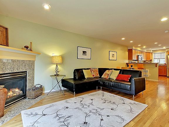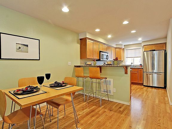 3-story townhouse w/top floor master. Living, dining & kitchen have real oak floors (not the thin veneer). Sliders from living room lead to paver-stone patio & professionally landscaped garden w/great south & west light. Kitchen has granite counters & stainless appliances. 2nd floor has 2 bedrooms, full bath w/dble vanity, & laundry closet w/front loading W/D. 3rd floor is all master suite, with 3/4 bath and walk-in closet. Great bus service. Leave the car at home!