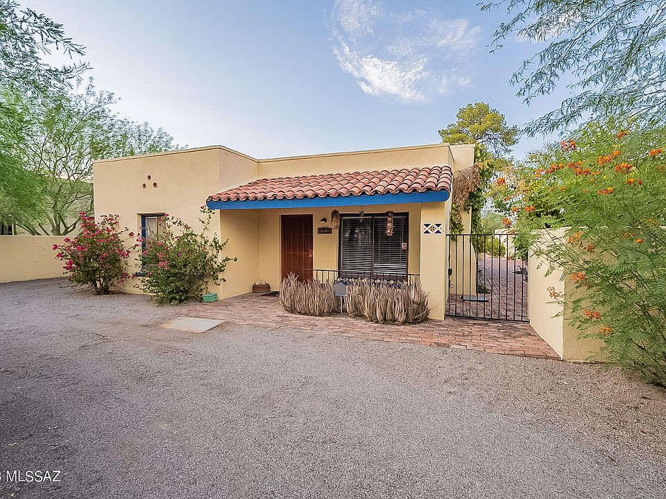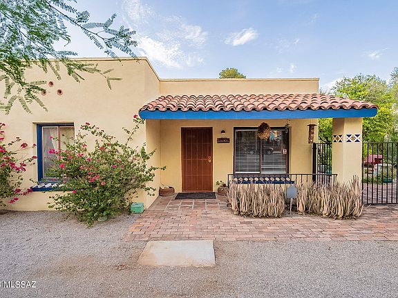Amazing historic charm meets modern allure! Nestled in the heart of a historic neighborhood, this captivating 3-bedroom, 2-bathroom home with 2,027 square feet of living space seamlessly blends the best of both worlds.Step inside and be instantly enchanted by the warmth of the quaint Cocina, featuring hand-painted Mexican tile counters, original Saltillo tile flooring, exposed beams that stretch across the ceiling and natural light that dances through the generous bank of windows, revealing the brick courtyard. The back yard is complete with fruit-bearing lemon, orange and grapefruit trees, pomegranate and olive trees, Mexican petunias, and a variety of flowering plants. This double lot property is completely walled and gated, with a separate storage shed and rustic potting shed.