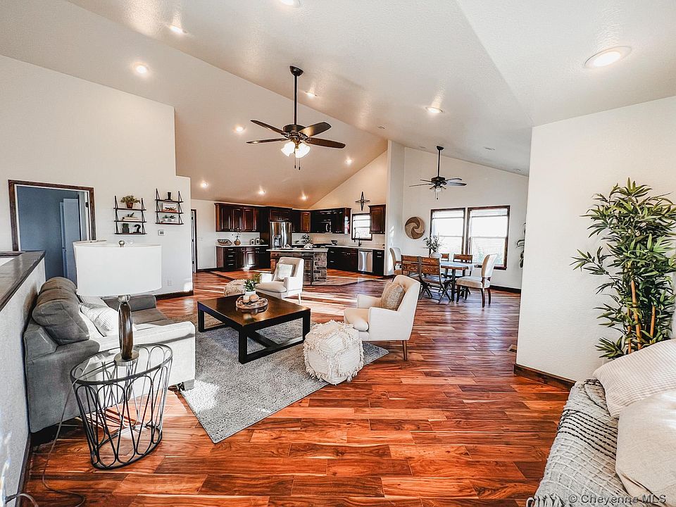 STOP! Located on TWO separate parcels of Wyoming peace (parcel one 5.92 acres, parcel two 5.51 acres for a total of 11.43 acres) and rolling terrain just east of Cheyenne (light covenants!) this fully finished 2019 built home offers nearly 1900 sf of main level living and a fully finished walk out basement. Beautiful acacia hardwoods grace the entire main level- including the bedrooms- and the open floor plan creates a welcoming atmosphere. Well designed plan offers a spacious laundry room off the garage, a kitchen with quartz counter tops, dual pantries and plenty of work space. Generous owners suite wows with vaulted ceilings, designer paint choices, walk in closet with natural light, and five piece bath. Mature trees and privacy abound! Enjoy the extra space and privacy of the adjoining lot, keep it for future build endeavors, or enjoy the built in equity of the additional parcel!