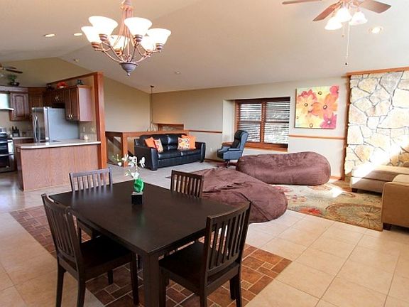 This spacious, contemporary home sits on a large corner lot and has over 2,700 sq ft of living space. The main level has an over-sized master bedroom with two closets, a vaulted ceiling, and a bathroom which is accessible from the bedroom or hallway. There's a second bedroom on the main level, as well as an extra-large living room with a vaulted ceiling and an adjacent dining area. The kitchen comes well-equipped with stainless steel appliances, including a refrigerator, dishwasher, microwave, and range/oven. The lower level offers a second living room, sun room with wet bar, three bedrooms, a bathroom, and a laundry/utility room complete with washer and dryer. In the backyard, enjoy grilling on the back deck or have a swim party in the in-ground swimming pool with diving board. The wood fence and trees around the backyard helps with privacy and creates a private retreat. This house is great for all of your indoor and outdoor living and entertainment needs.