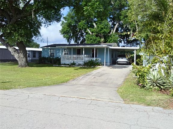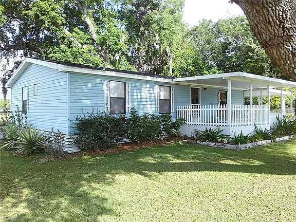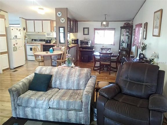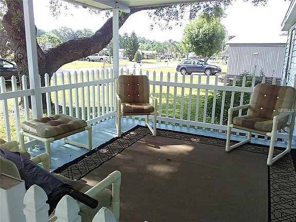 OVER 55 COMMUNITY & you own the land. This is a beautiful home and the owners are seasonal. This home has had Poly Butylene (blue piping) removed per seller in 2002. Seller was told roof was nearly new at that time also. Porch and carport ceilings replaced, Birch hardwood floors in main living areas installed, trees trimmed from roof areas and new hot water heater. Nice size kitchen offers a built in breakfast table and pass thru to dining room, stove, fridge and dishwasher. There is an indoor laundry room with front load washer for sale separately. Down the hall is a master bed and bath with tub & shower where a King bed leaves plenty of extra room. Bed room 2 is also nice sized and is near hall full bath with shower. The rear lanai is screened and overlooks a beautiful back yard which is fenced by the road. There is a carport and two sheds offering plenty of storage. The open but covered entry front porch has attractive railings and gate and comes furnished. Entire home can convey furnished except washer and dining table which can be purchased separately. Some yard item including an older riding mower will stay as will a small air compressor and various tools. This seller does not have a survey available. HOA feed include your water, mowing of common areas and street lights. Buyers must be 55 or older and association approval.