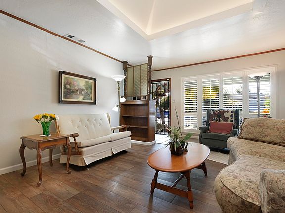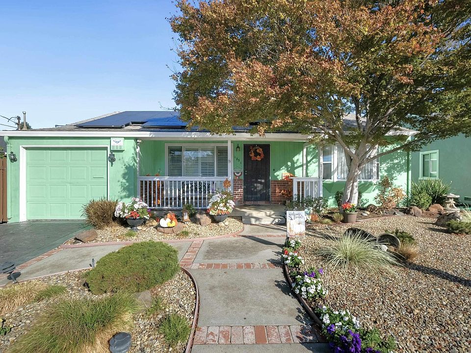 Welcome to 1231 Via Los Trancos located in the San Lorenzo Village! This charming home features 3 bedrooms, 2 full baths, 1 car attached garage, 1563 sqft of living space situated on a 5610 sqft lot. The open concept feel features an expanded kitchen with plenty of cabinetry, counter space, and optional eat in breakfast area. Expanded dining area adjacent to the kitchen is perfect for large family dinners and entertaining. Spacious family room features a beautiful corner brick gas fireplace for those the cozy movie nights or entertaining, Private bedroom and bath lends to generational living. The newer roof installed in 2016 provides peace of mind for years to come. The beautiful hardscaped front yard with a stamped decorative driveway adds curb appeal to this lovely home. Enjoy the convenience of central heating with AC and Solar panels, as well as recessed lighting and natural light from skylights. The spacious primary bedroom boasts a bay window, while the tranquil private backyard includes a koi pond, grass area, and rosebushes. The backyard also features a storage shed, irrigation well for watering, and a sunroom adjacent to the family room. Don't miss out on this wonderful opportunity to make this your new home!