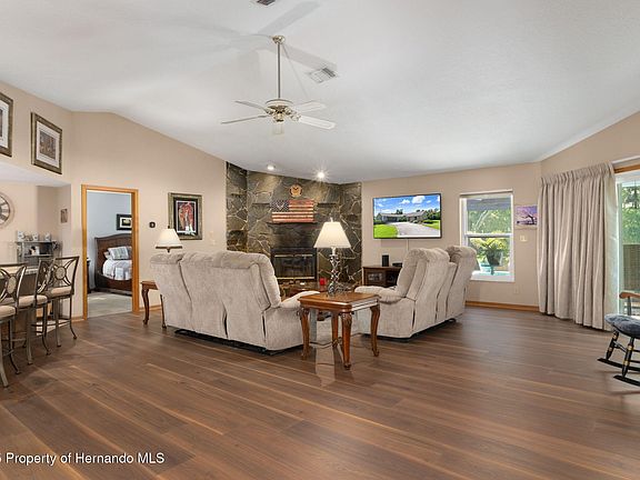 Meticulously Maintained POOL Home with Custom Outdoor Kitchen & Recent Upgrades! Come on over and check out your beautifully cared for 2-bedroom, 2-bathroom POOL home that blends comfort, functionality, and outdoor living in one perfect package. Located in a quiet neighborhood in the heart of Spring Hill, this home has been thoughtfully updated and is truly move in ready. Inside, you'll find a warm and welcoming layout featuring cathedral ceilings, new flooring, custom window blinds, and a cozy wood burning fireplace in the living room. The kitchen offers incredible refinished countertops, a breakfast bar, and plenty of cabinet space, perfect for casual meals or entertaining with family and guests. The primary bathroom has been tastefully upgraded, and both bedrooms are generously sized with plenty of natural light. Enjoy peace of mind with major updates already completed, including a 2020 roof, 2022 air conditioning system, and newer windows throughout. Outside, you'll find your crystal clear pool is complemented by an electric pool heater, making it usable year round. The screened in back patio is an entertainer's dream, featuring a massive custom outdoor kitchen complete with a built in grill, smoker, sink, and fridge perfect for gatherings or quiet evenings at home. Your lush green backyard also features a 2025 stand alone storage shed and a private well for irrigation, helping to keep your landscaping lush without added expense. This is a home that's been loved and it shows. Schedule your showing today and experience all the comfort and quality for yourself!