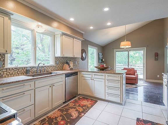 Stunning contemporary home with Breathtaking views of Leawood South's 15th fairway! Half acre cul de sac lot! Vaulted ceilings on main level.Newer handscraped hardwoods, wood stairs, wrought iron handrail, newer carpet, todays colors, granite countertops, newer baths, glass tile, 5 burner gas stove, newer roof and gutters. Huge walkout, finished lower level. Private deck expands entire back of home. Open floorplan perfect for entertaining. Walk to elementary and middle schools. Blue Valley North High School