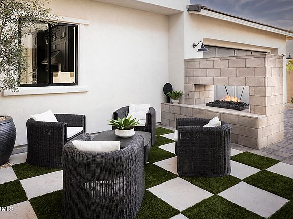 The stunning Sterling model comes complete with landscaping in both the front and back yards, as well as a spacious four-car tandem garage. The kitchen is adorned with KitchenAid Pro Premier Appliances and features a thoughtfully planned cabinet layout. In the foyer, a trey ceiling adds elegance, while the great room is highlighted by a multi-panel center sliding glass door. Additional luxuries include an AV built-in with a fireplace, a guest suite with a living area, and a lavish owner's bath. All conveniently situated in the sought-after Cactus corridor.