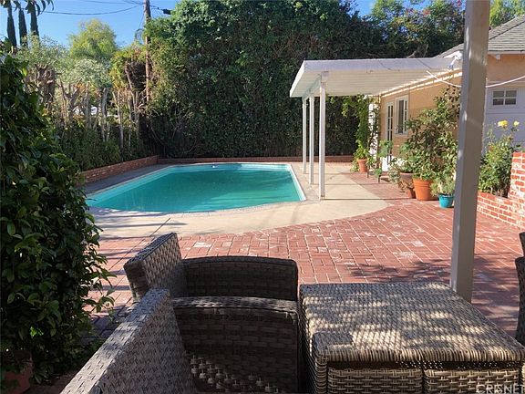Absolutely adorable cottage set on a tree shaded lot in one of the best Valley Village neighborhoods. Surrounded by expensive new & remodeled homes selling for far more, here's your chance to have an affordable home of your own in a fabulous established community. Traditional oak floors, living room warmed by a corner fireplace, true formal dining room, kitchen with LOTS of space to cook up yummy meals. Updated full bath & expanded 3/4 bath with a HUGE custom tiled shower. French doors in bedroom 3 open to a sparkling pool that will provide LOTS OF FUN! The detached 2 car garage (a portion is finished for use as a home office or convert the entire garage to a trendy ADU) plus there is another separate studio that has lots of uses: hobby room, storage, man cave??? There's plenty of off-street parking on the long driveway plus more behind a gate.