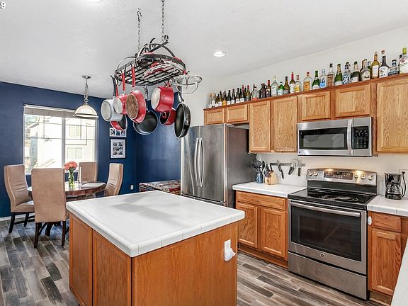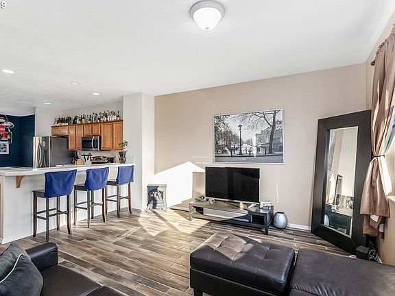 End unit condo that is light & bright! Open main floor layout w/high ceilings on both levels. Nice sized kitchen with lots of cabinets & countertop space, island, eating bar, pantry & all appliances included. Master bedroom has walk in closet & both upstairs bedrooms have access to bathroom. Large garage with tons of storage space. Private & fenced back patio. Convenient location with easy access to shopping, restaurants, & I-205.
