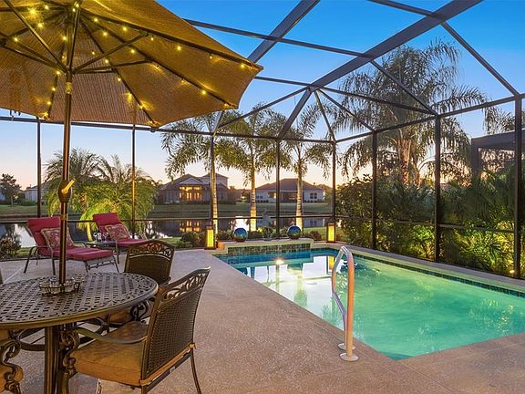 With over $130,000 in upgrades, premium southern exposure lot on a lake, this home presents an opportunity too good to pass. The 3 bedroom, 2 ½ bath plus den split floor plan, over 2,200 square feet and an additional 1,400 sq. ft. of outdoor living space creates the perfect backdrop for entertaining and having overnight guests. As you enter through the front door, you are immediately greeted with tranquil views of the pool and lake beyond. The kitchen has all the items you desire: gourmet appliances, granite counters, breakfast bar seating, eat-in kitchen nook, walk-in pantry, recessed, pendant & under cabinet lighting. The den is large enough to become a 4th bedroom, an office or a hybrid. Diagonally laid tile, recessed lighting, crown molding, and volume ceilings are throughout the main living areas. Sliding pocket doors, an oversized lanai & screened enclosure plus pool and pool bath make indoor-outdoor living seamless and functional. Some of the notable features of this Green certified home are: radiant barrier shield added to roof, R38 insulation, foam insulation in exterior concrete blocks, in-wall pest system, 15 Seer HVAC, and natural gas for range, dryer, water heater. Central Park has HOA fees yet offers gated entry, manicured common areas, 10-acre park with tennis courts, pavilion, ballfield, 2 dog parks, picnic areas, playground, splash park & paths. The location and upgrades combine to create a carefree, low cost, oh-so-enjoyable Florida way of life. All you have to do is relax and enjoy.