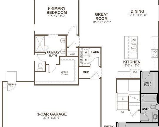 The must-see Elderberry plan boasts ample space for entertaining. On the main floor, you'll find an open dining area, an expansive great room, a convenient laundry and a well-appointed kitchen with a center island and walk-in pantry. An impressive primary suite, located just off the great room, showcases an immense walk-in closet and a private bath. Upstairs, discover an airy loft, a storage area and two secondary bedrooms.