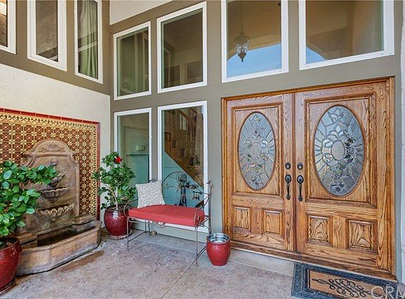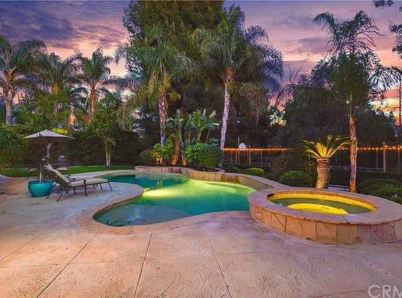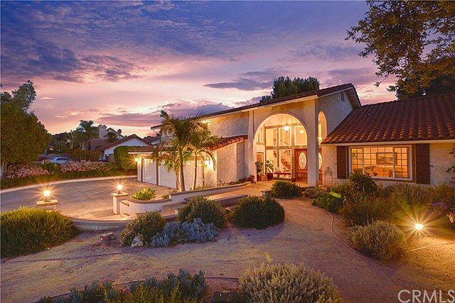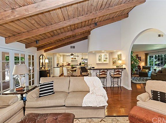 Fully gated Mediterranean style estate home with drought tolerant yard and plenty of privacy. Home has wood floors, beamed ceilings and vintage wood mantle over the gas fireplace. The family room also features a wet bar in the family room with beverage refrigerator, and custom built in entertainment center. The kitchen has been recently remodeled with quartz counters, large island, leaded glass fronts in some of the cabinets, brushed brass hardware, faucets and lighting, stainless steel appliances and is open to the family room. Two master bedrooms make this home perfect for multi-generational living. Master upstairs is large with private balcony and gorgeous view of Riverside and the mountains, recently remodeled bathroom with custom cabinetry, marble counters, walk in closet and rock wall in the shower room. Down stairs master is a bit smaller and has attached bath with dual vanities, walk in closet and separate entrance to the outside. Two bedrooms share a Jack and Jill bathroom, and remaining downstairs bedroom is large with a wall of closets. This home is made for entertaining.....with two sets of french doors leading to the spacious patio area with built in BBQ, storage/ serving cabinet with built in blender, gazebo for shaded dining, swimming pool and spa with natural rock coping. Yard also feature a sport court for basketball, volleyball, or larger parties. 3 car garage features lots of shelving and epoxy flooring for easy maintenance.