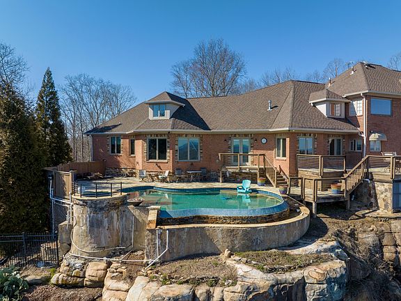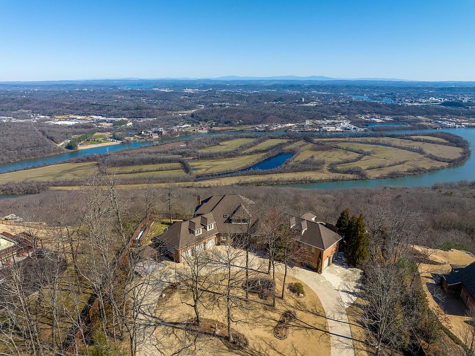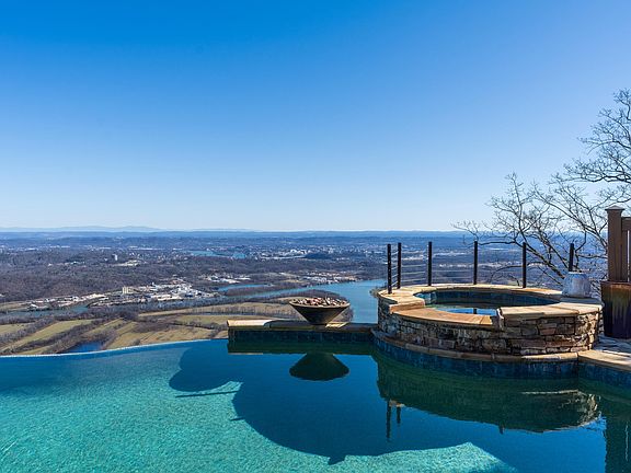 Beautiful, custom built, mostly brick, 6 bedroom, 5.5 bath home situated on 2+/- acres with stunning views of the Tennessee River, Williams Island and the Baylor School from the Elder Mountain brow. The property is gated and fenced for privacy and boasts mature, irrigated landscaping, as well as multiple outdoor amenities, including the circular driveway with center koi pond and fountain, a quaint gazebo, a tiered stone patio with a salt water heated infinity pool and spa with waterfalls, a side fenced yard, a covered front porch with double door entry, 16 exterior cameras, new lighting rods on the roof, two recirculating water heaters, a Generac generator, and more. The home itself is a comfortable mix of modern and traditional with spacious rooms, the master plus a guest bedroom on the main level, a central gathering space open to the kitchen and breakfast area, an office, formal dining and sitting area, 2 bonus rooms, fantastic storage throughout, a 3-bay garage on the main with a workshop area, plus a partial basement with 2 additional garage bays, a full utility bath and extra storage. Your tour begins with the dedicated foyer with a sweeping staircase, French door to the office and large opening to the formal dining and sitting room. The kitchen is open to the breakfast area which has a sliding glass door to rear patio and French doors to the hallway. The kitchen also has granite countertops, tile backsplash, high end stainless appliances, a built-in desk, and a walk-in pantry. The breakfast area opens to the gathering room which has a partially coffered ceiling and a wood burning fireplace/Buck stove with stacked stone surround. The hallway leads to a powder room and laundry room with access to the main garage with rubber tile flooring, hanging corner gas heater and workshop space. The main level bedrooms are in the new wing of the house, which was added approximately 12 years ago, including the master suite which has a trey ceiling, large picture window to take advantage of the view, his and her walk-in closets, and walk-in closets, and a double shower with body jets and tile and glass surround. The guest bedroom has the use of the full hall guest bath. This wing also includes 2 upstairs bonus or hobby rooms and the basement garage which has 2 bays, a full utility bath and room for storage and/or work space. The rest of the 2nd level has 4 additional bedrooms, 2 of which have private baths, plus another full hall bath. Simply a fantastic opportunity for the discerning buyer seeking a mountain home with scenic brow views and the privacy that both the acreage and this setting provide, so please call for more information and to schedule your private showing today. Information is deemed reliable but not guaranteed. Buyer to verify any and all information they deem important.