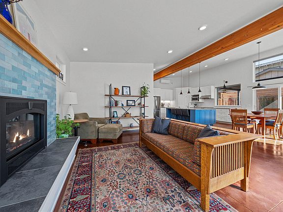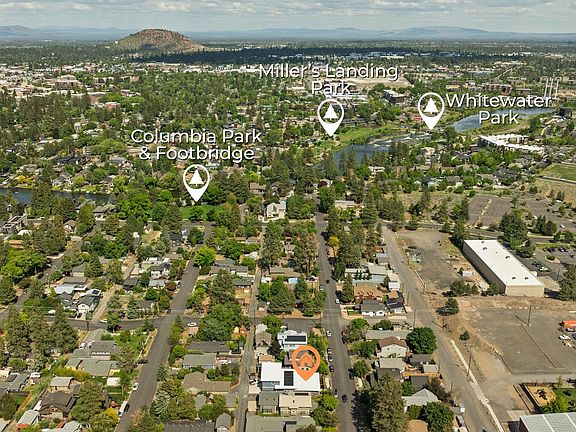 Discover this sleek, modern home on Bend's west side, just steps to shopping, restaurants, and the Deschutes River. Designed for energy efficiency and low-maintenance living, this home boasts 8 KWH solar panels, concrete floors with radiant heat, triple-paned windows, Navien tankless water heater, air filtration system, & smart home features. The single-level main residence with 2 bedrooms, 2 full baths, and built-in office area is bright and airy with generous windows and vaulted ceiling. The expansive 1 bedroom/1 bath ADU above the garage is perfect for guests, rental income, or multi-generational living, with access from the main house or outside. The oversized garage is ideal for outdoor enthusiasts, with room to park a Class B RV and store all your gear. The low maintenance outdoor space has a south-facing garden area, patio with pergola off the dining area, and is wired for a hot tub. Enjoy the perfect blend of style, convenience, and sustainability in a sought-after location!