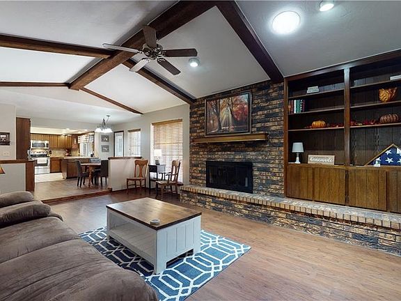 Move In Ready. The seller has done the work for you. New vanity in the master bathroom, barn doors in the master, interior paint, indoor sewer lines replaced in 2015, newer roof, new storm shelter, new back doors. Newer flooring in the living room, family room/dining room and 3 bedrooms. Spacious living room is open to the kitchen/dining area. Built- in hutch in kitchen/dining would make a great coffee bar or serving area. Enjoy the view of the very private and spacious backyard from the enclosed patio. The window from the kitchen to the back patio makes family picnics on the patio a breeze. You will enjoy not having neighbors right behind you. Neighborhood Walking Trails, Saltwater Swimming pool, Tennis/Pickleball Courts, Basketball Courts, Ponds and Play Ground nearby.