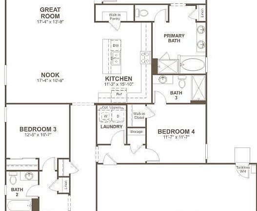 The stunning Slate plan opens with two bedrooms flanking a full hall bath. Beyond the entry, you'll find an open layout offering a dining nook, a great room with access to an inviting covered patio, and a kitchen with a center island, walk-in pantry and abundant cabinetry. The primary suite is nearby, boasting a generous walk-in closet and a private bath with a separate shower and soaking tub. Select homes will offer deluxe features in the primary bath. A laundry room and a fourth bedroom with an attached bath are also included. You'll love the professionally curated finishes!