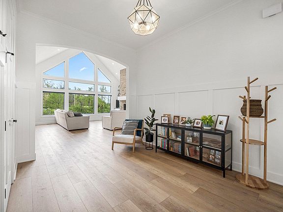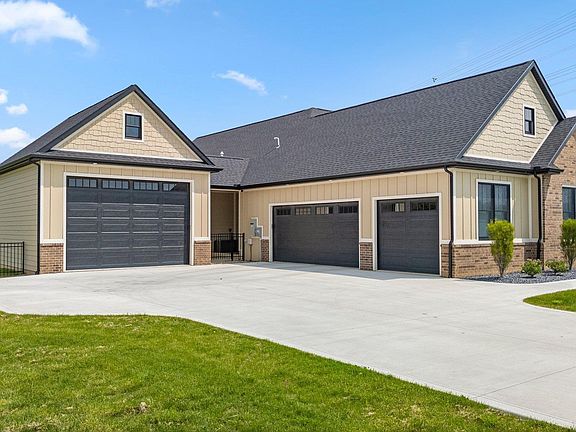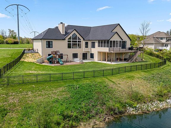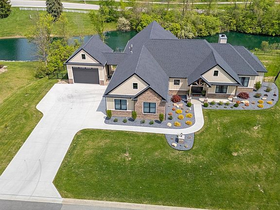 Incredible 5BR/3.5BA custom ranch with over 5,300 finished SF, ideally situated on a scenic pond lot with a walkout basement and premium upgrades throughout. The main level features 10’ ceilings, a stunning cathedral-ceiling great room with a wood-burning fireplace, and four spacious bedrooms—all with walk-in closets. The primary suite offers a tray ceiling, pond views, and a spa-like en-suite bath with large walk-in closet. You’ll also find a large laundry room, mudroom, and an oversized walk-in pantry for added convenience. The gourmet kitchen features floor to ceiling custom cabinetry, an oversized island with bar seating, and opens to the Great Room and Dining space. Double patio doors leads to a screened porch and Trex deck—perfect for entertaining or relaxing while overlooking the pond and fully fenced backyard. The walkout basement features 9’ ceilings, a fifth bedroom (with walk-in closet), full bath, home office, home gym, wet bar, and 2 expansive rec spaces—ideal for work, play, and guests. Car enthusiasts and hobbyists will love the attached 3-car garage plus an oversized 2-car detached garage with tall garage door. All bays have wiring for EV charging. Detached garage would be a perfect space for RV storage, hobby room, tool shop, golf simulator, or expansive home gym. Low threshold driveway curb. Other highlights include Andersen 400 Series windows, a zoned HVAC system, whole-house humidifier, generator and hot tub hookups, and water softener rough-in. Finished SF includes 3,015 SF on the main level and 2,365 SF finished in the basement (3,015 total basement SF). This meticulously maintained home offers comfort, space, and flexibility inside and out.