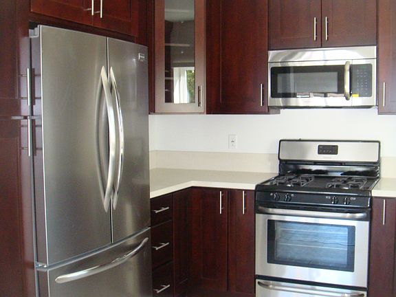 Stylish wood laminate and tile floors. Kitchen includes stainless steel refrigerator, stove, microwave, dishwasher and quartz countertops.