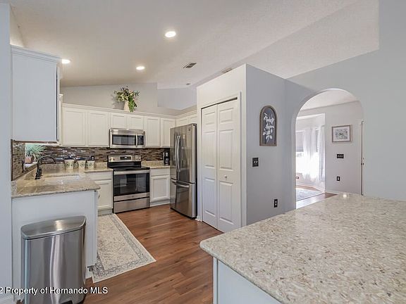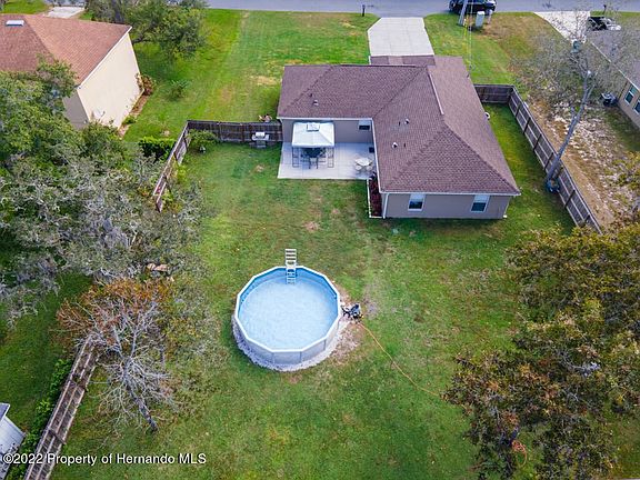 Welcome to Royal Highlands! This 4 Bedroom 2 Bath well maintained home, on almost 1/2 acre completely fenced. The home includes a 2-10 Home Warranty for 1 year, for added peace of mind.The backyard has a new 15x24 patio, above ground pool and a 12x20 shed. New leach field in May 22 New well pump in May 21 Bladder in 2017, Driveway was redone in 2020, Roof with transferable warranty in 2017. An 8 zone irrigation system was installed in 2021 and new exterior paint. Upon entering this freshly painted interior home, is where the beauty begins. Starting with the new front door is a living area that can be a dining room or an additional living room, off that is the spacious owner suite, with walk in closet. The owner bath has a walk in shower. The kitchen is equipped with stainless steel refrigerator, stove and microwave. There is also a dishwasher. There is a nice size living room and a separate dining area. There are 3 nice sized bedrooms which makes this split floor plan so unique. All the windows have Levolor Sun blocking honey comb blinds. The home also has a indoor laundry area which is right off of the newly remodeled main bath. A spacious shower was added in 2022. Did I mention that all the ceiling fans, and lighting in entire home was replaced in Oct. 22. The garage has been converted to another living space with heat and air that is currently being used as an additional bedroom. This could easily be converted back to a garage. The driveway itself will fit approx. 6 cars. Come take a look at this stunner. This Weeki Wachee home is close to Spring Hill, and Brooksville, and the Withlacoochee River to kayak, seeing the manatees and all that the Nature Coast has to offer. Veterans Hwy is not far away for the commute to Tampa International Airport. Or Head North to Crystal River for more of the beauty of the Nature Coast.