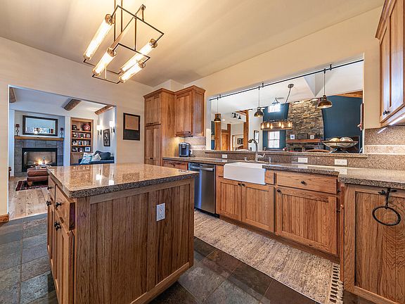 At the heart of the home is an open-concept chef's kitchen with granite countertops, a unique farmhouse sink, stainless steel appliances, and a large center island ideal for prepping meals or enjoying coffee at the bar. The adjacent den/sitting area features a gas fireplace, leather chairs, a loveseat, and a work desk, creating a cozy yet functional space to relax or connect. Gather around the family-style dining table before settling into the spacious living room, where a grand stone fireplace, plush sectional, and 75" flat-screen TV invite evenings of comfort and conversation.