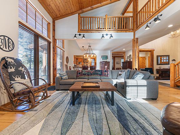 From the moment you arrive, you'll be surrounded by the warmth of rich wood accents, soaring ceilings with exposed beams, and custom finishes throughout. Vaulted ceilings and hand-hewn tree trunk details give the home a cozy yet grand lodge feel, while modern elements like sleek black lighting and designer decor add an upscale edge.