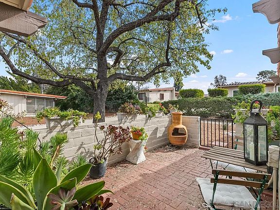 Located in a lush, quiet corner of the much sought after Seven Oaks, this upgraded 2-bd/2-ba unit lives like a detached home w/ front & back entrances w/ NO STEPS & one of the largest private patios in the community situated under a magnificent pear tree. Amplifying the sense of spaciousness & light, the fully enclosed former sunroom & study/den (off the dining area) both enjoy lovely views of a variety of trees & new drought-tolerant xeriscaping. The charming architectural details of this inviting home have been lovingly refreshed...CONTINUED BELOW