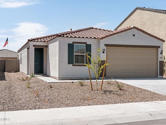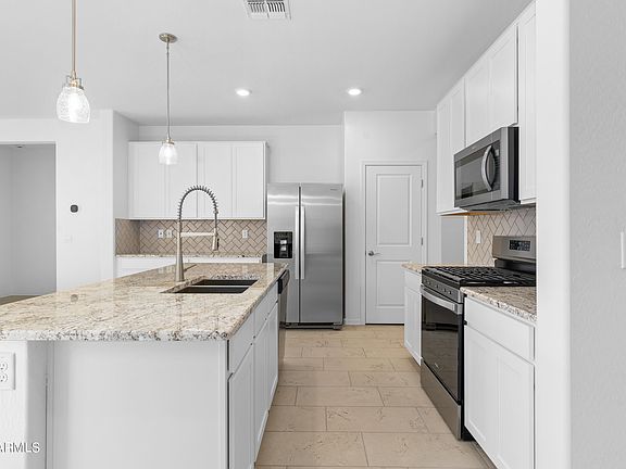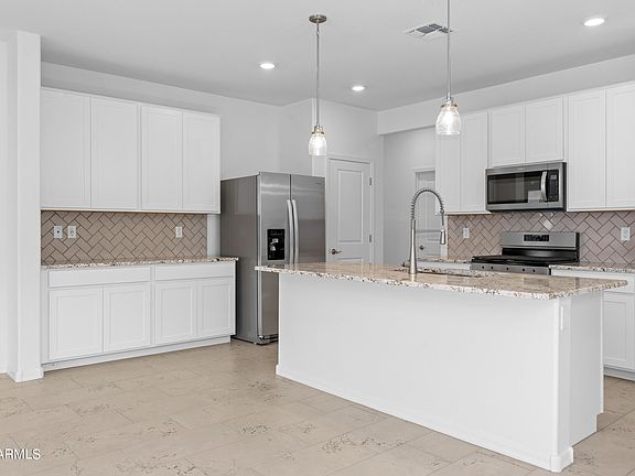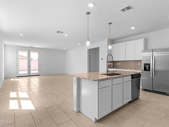 This lovely, single-story home features an open floor plan with 9-ft. ceilings and a spacious great room with a sliding door that leads to the private covered patio. You'll also find gorgeous porcelain Emser® tile flooring throughout the common areas, and luxurious Shaw® carpeting in each bedroom. The expansive kitchen offers 42-in. upper cabinets, large center island, tile backsplash and Whirlpool® stainless steel appliances. The primary suite features an oversized walk-in closet and the connecting primary bath boasts a full walk-in shower and dual-sink vanity with WaterSense® labeled fixtures. This ENERGY STAR® certified home includes a gas water heater and energy efficient A/C with ecobee smart thermostat.
