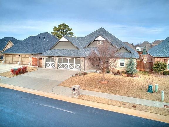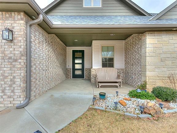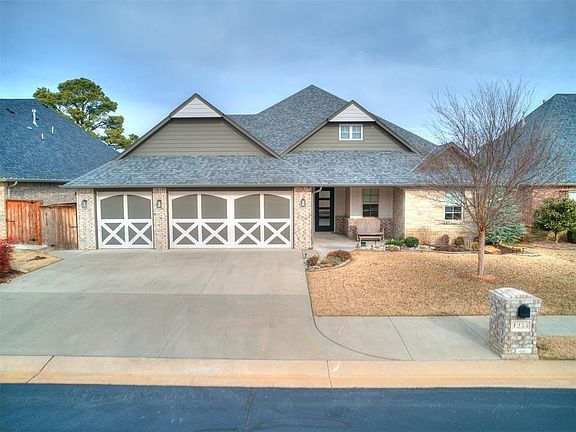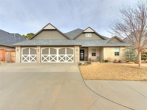 Some photos are virtually staged to show options of furniture placement**$30,000 towards home improvements since Sept. 2022: Back yard landscaped with additional trees, kitchen refrigerator, replaced wood flooring, lighting fixtures, fans, and paint. Enjoy this Modern/Craftsman design nestled in a cozy secure community located minutes from restaurants, downtown Edmond, Golf and Tennis Courts, Mitch Park and I-35. Once you enter Hutton Place and discover this home you'll see why you can enjoy some relaxing time on your front porch with neighbors strolling by and maybe a really great book! Open floorplan with 3 beds, 2 baths, solid surface flooring throughout except carpet in primary closet, and 3 car garage with garden shed and tankless hot water. Primary bathroom suite is roomy with large step in shower, separate vanities, and roomy closet leads to utility room for easy access. Benefit from the spacious living and kitchen area with expansive island, double ovens, gas cook top sizeable dining space, storage pantry, ample built-ins, stone fireplace, and remote blinds in living room that open up overlooking expansive back patio with gas hook up, flat screen TV, built-in speakers ideal for outdoor gatherings. May this serve as your future home & neighborhood!