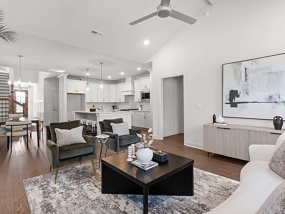 The living room, with its vaulted ceilings, is the perfect venue for relaxation and social gatherings, seamlessly connecting to the back patio and flat backyard. The wooded backdrop provides a private, tranquil setting ideal for outdoor enjoyment.