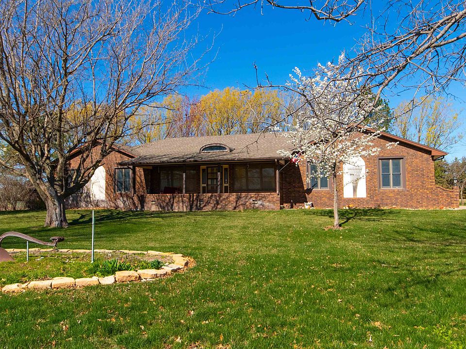 Dream farmhouse in a highly-desired, private addition in Goddard! Live your idyllic, peaceful lifestyle in the countryside in this impressive farmhouse estate. The mature trees surrounding the property add to the serene feel of the land. This single family home sits on a sprawling 4.76 acres, featuring 3 main structures: a 3,836 sq ft 5 bed, 4 bath, 3 car garage homestead, an extended greenhouse/outbuilding, and a large outbuilding with a loft and large entry door for heavy equipment/vehicles. This hidden gem provides a tremendous opportunity for its future owners! You’ll immediately feel at home when you see the spacious, covered front porch where you will enjoy your evenings relaxing and enjoying the beautiful views. Upon entry to the interior, you’ll be welcomed by a beautiful ornate chandelier illuminating the entryway. The open concept layout allows you to view the great room, formal dining room, and the spacious living room with a cozy brick wood-burning fireplace and sliding door access to the pergola and open deck beyond. The expansive kitchen features tons of cabinet and counter space, as well as an elongated breakfast bar, with the laundry room/mud room located right off the garage entry. Down the hallway, you will find the master bedroom that is cast with a large window for natural lighting, wood laminate floors, a large closet space and an ensuite full bath. Two additional bedrooms on the main level share hall access to a full bath that features luxurious tilework and a whirlpool. The finished mid-level walkout basement features a built-in buffet area perfect for gatherings, a large open rec area with pool table included, and an added on sun room with large windows and access to the exterior. Two bedrooms, a storage area and 2 additional BONUS rooms can also be found in this space! The exterior of the home has even more to offer! The oversized deck with pergola provides the ideal atmosphere for friends and family, overlooking the gorgeous coy pond. The large greenhouse/outbuilding provides more than enough space for any need you may have for it. Towards the back of the property, near the well-maintained lagoon, you’ll find the larger outbuilding with heavy equipment/vehicle access and a loft. The 3-car garage features an abundant amount of built-in cabinets and its own kitchenette with fridge and a stove. There is a water softener system and reverse osmosis system to help keep the property at tip top shape. Enjoy life at your own pace away from the hustle and bustle of the city, while having quick and easy access to it if needed. Call us to schedule an appointment for an exclusive showing today!