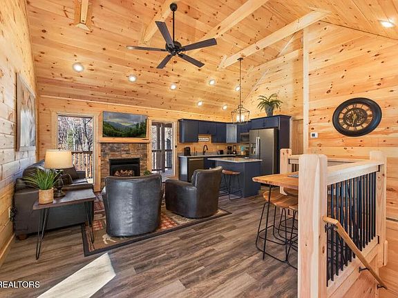 The cozy mountain cabin you've been searching for is here. Located in an amenity-rich Parkside Resort community, this new construction 2-bedroom cabin is a breathtaking retreat where relaxing mountain luxury meets Pigeon Forge excitement. The Serenity cabin is aptly named, set in a relaxed community with access to an indoor pool and clubhouse featuring a fitness center, dining and arcade, while also being embraced by the beauty of majestic trees and rolling mountainsides. Arrival is a breeze, with level parking in front of the cabin and a wraparound deck that provides a fresh vantage from all angles. Step inside and you'll be greeted by soaring vaulted ceilings, exposed beams and warm wood accents that immediately make you feel at home. The open plan living area is anchored by a stunning gas log fireplace and flanked by large windows, perfect for chilly mountain evenings with a view. A modern kitchen brings custom charm with gorgeous cabinetry, upgraded stainless steel appliance package and center island. This spacious 1500sqft cabin offers a bedroom and bathroom on each level for enhanced privacy, as well as a large rec room on the lower level that walks out to a hot tub and lounge deck. Everything in this cabin is new and premium including the flooring, appliances, fireplace and log set, as well as the bathrooms - That's easy-care, peace-of-mind ownership right from the start! All this and a prime location? Absolutely!! You and your guests will be at the center of it all, with easy access from this tranquil community to everything Pigeon Forge has to offer including numerous attractions like Dollywood, The Island in Pigeon Forge, nature trails, parks, dinner theaters, mountain coasters, and more, not to mention a host of shopping and dining options to suit any taste. The many must-see-and-do activities of Gatlinburg are also conveniently nearby. Don't miss the opportunity to own your own peaceful slice of the mountains! Buyer to verify all information.