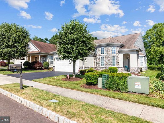 Enjoy Heritage Creek Estates, an ACTIVE Active Adult Community in the heart of Bucks County. One floor living in this Single-Family Ranch style home set on Premier lot. Covered porch at front entrance with built-in bench. Open and Spacious floor plan. Exterior front has decorative stone facade. Kitchen is well designed with large counter space and is open to dining area. Dining area with beautiful bay window is adjacent the comfortable family room with fireplace and natural gas insert. Living room is positioned in the front with high ceilings and great windows. Recessed lighting and ceiling fans throughout. Sunroom is entered through French doors and Sunroom offers lots of windows and has access to the back-yard patio. Exterior patio great for enjoying wildlife and entertaining. Master bedroom with walk-in closet enjoys Master bathroom including double vanity, deep-soaking tub, walk-in shower, and linen closet. Second Bedroom with double closets. Full bathroom off second bedroom. Double French glass Doors lead to Den, Office or even 3rd bedroom. Laundry room with wash-sink. HVAC furnace & air conditioning is 9 Years with built-in ultraviolet light to effectively kill most germs. Oversized Two-car garage with electric door opener and pull-down stairs to attic for additional storage. Best of All -extremely close proximity to the area~s best club house; enjoy indoor and outdoor swimming pools, tennis, shuffleboard, exercise equipment, and many, many activities.