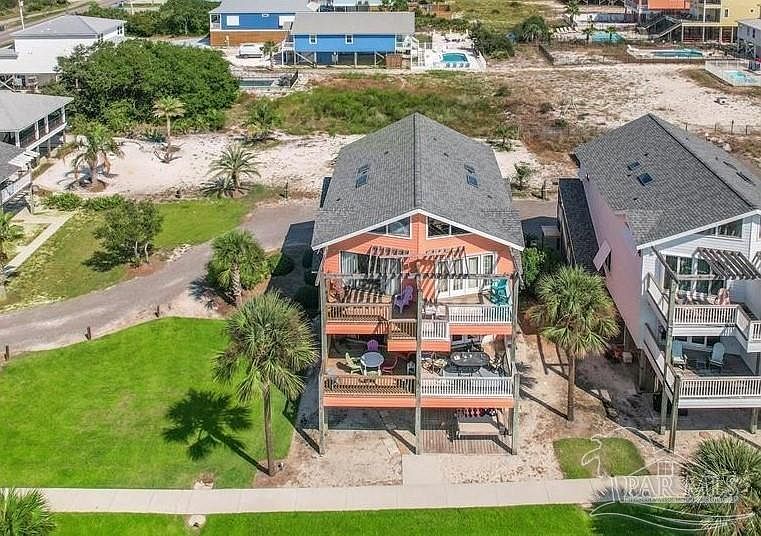 Nestled between the Gulf of Mexico and Little Lagoon, this unique beach community offers deeded beach access and a beautifully landscaped "green" area. Enjoy views of both the Gulf and Little Lagoon from new decks. This home features an open floor plan with a kitchen, living area, and full bathroom on the main level, plus a bunk room and primary suite upstairs. Recent upgrades include a new roof, decking, paint, and AC unit. Covered parking and outdoor storage add convenience.