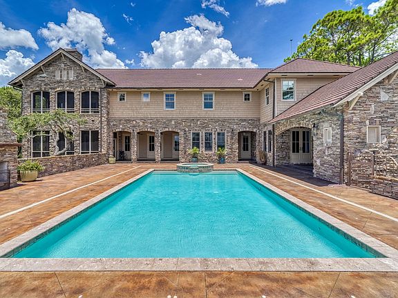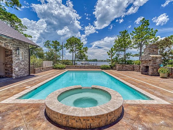 JUST REDUCED! Discover unmatched luxury at this breathtaking lakefront estate with enormous pool & spa in the gated Wild Heron community on Lake Powell with spectacular water vistas throughout. A short boat ride from your private dock through Florida's largest & loveliest coastal dune lake brings you to a stunning, isolated beach. Designed for entertaining, elegant spaces welcome gathering & relaxation including a media room with movie screen, a walk-in wine cellar & full-size bar. The spacious first level living area is highlighted by coffered ceilings & a gorgeous stone hearth fireplace while a study & office provide thoughtful spaces to work. The dining room includes exposed beams, arched entryways & stately columns. The gourmet kitchen has triple granite counters,