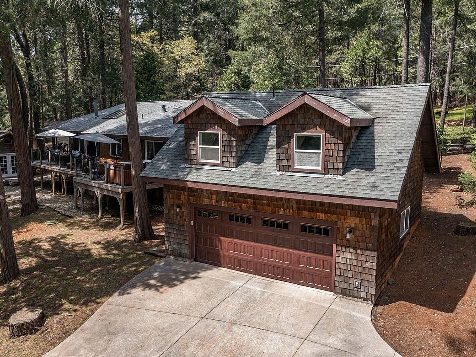 Towering pines, Madrones & Cedar siding surround this enchanted home on Lower Banner Mountain in Nevada city that boasts rustic elegance throughout. Views beckon beyond through the large glass sliders as you enter the front door but opens to large kitchen and great room with gorgeous custom cabinetry, tile counters, SS appliances & breakfast bar. You will love the hardwood floors, skylights, rustic wood beam ceiling & a slate hearth w/wood stove. In a corner of the great room is room enough for large dining table and chairs. Remote den has wood beam ceilings and slider to part of the large back deck for entertaining and BBQs. Main suite is spacious with a bathroom that feels spa like and outside access to the rear deck with private hot tub area. Second and third bedrooms are large and abundant with light. Murphy Bed included in one of them. Full bathroom and an extra half bath for guests. Laundry room near the den has cabinetry and utility sink. Above the detached two car garage is a studio with full bath that could be an Airbnb. Separate bunkhouse could be remote office, workshop, retreat, playhouse, art studio?? Remote firepit w/seating to share campfire stories. Even a chicken coop! Bonus! Automatic whole house Generac generator! If you lived here, you'd be home already