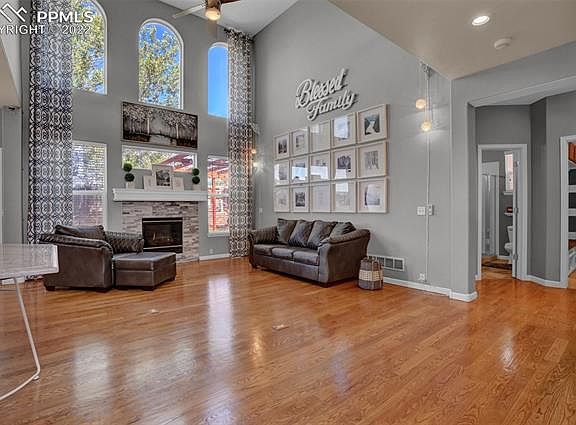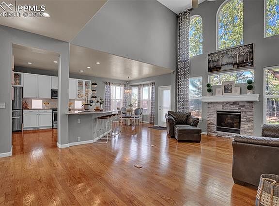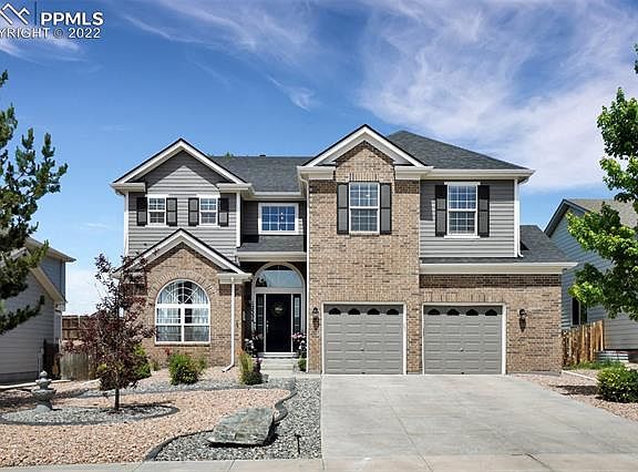 Beautifully updated home that backs to the rec center in Woodmen Hills. This incredible home has 6 beds, 4 baths and a 2 car oversize garage,* granite countertops throughout the house * The main level features hardwood flooring * Phenomenal Gourmet Kitchen with granite countertops, stainless steel appliances, 42' lighted cabinets, farm sink, and eat in kitchen nook * formal dining room, gorgeous stone fireplace with custom mantel, custom drapes, soaring 18' ceilings in the living room * laundry room w/ built in mudroom storage * The main level has a bedroom and bathroom. Upstairs you find the master suite with adjoing spa like bathroom, generous walk-in closet, and views of Pikes Peak. Across the catwalk are two more bedrooms, a loft, and another bathroom. Downstairs has a family room/entertainment room, two bedrooms, and a bathroom. The backyard has towering trees for privacy, an extended stamped concrete patio w/ a 16x14 lighted pergola. you will find plenty of storage with the 8x10 Tuff Shed. Too many upgrades to list! New exterior paint 2020, new roof 2020, A/C with whole house humidifier, new hot water heater 2020, custom window well covers w/ locks, LED recessed lighting, new carpet 2019, beautiful landscaping. Don't let this one pass you by. Won't last long!